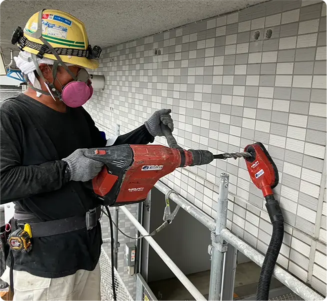 コア穿孔工事は、コンクリート構造物やアスファルトなどに専用の機械を使って円形の穴を高精度に開ける工事です。主に給排水管や電気配線、空調ダクトの貫通、アンカー設置時などに利用されます。 低騒音・低振動で施工可能なため、建物や周辺環境への影響を最小限に抑えられ、居住中の建物や稼働中の施設内でも安心して作業を行うことができます。 直径や深さなどの条件にも柔軟に対応でき、幅広い現場で活用されています。