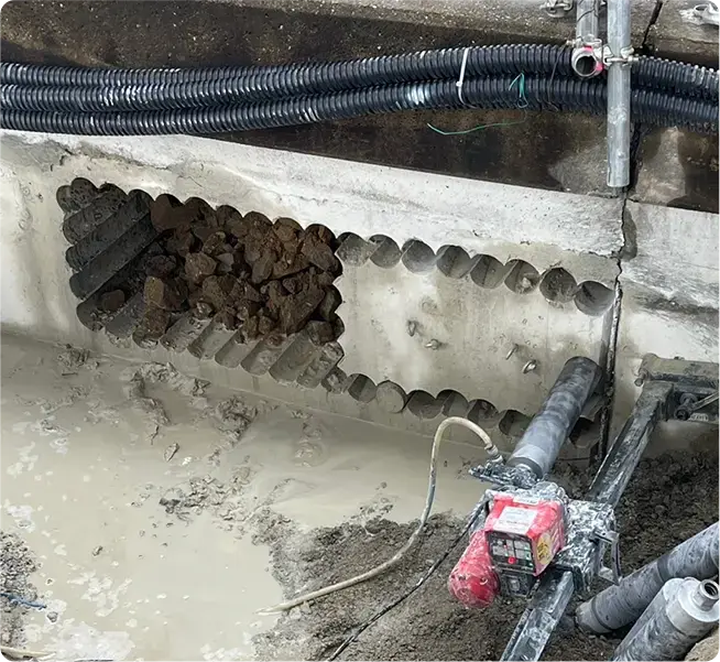 連続コア削孔にて歩道下のRCボックスに開口部を作成。 配管を通すために既存部に開口が必要になったので斫ると残しの部分までクラックが入ったり影響があるので連続コアにて低振動で施工。